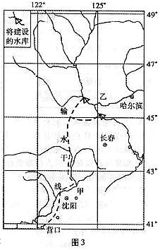 5、单选题 早自清康熙22年(1683年),我国就曾有开辟辽河至松花江的水陆联运构思。孙中山在《建国方略》中也对沟通松辽两大水系,发展航运和海港作了专门论述。图3为我国“北水南调”工程规划示意图,读图3,完成7-8题。