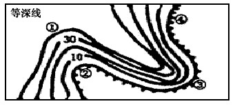 2、单选题 分析某海湾放大图,其中最适宜建港口的位置是
