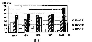 5、单选题 读我国某省1965—2000年三大产业结构变化统计图(图8),回答17—18题。