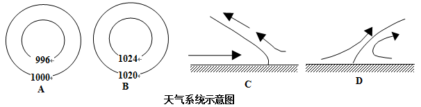 (4)说出图中D天气系统强烈发展后一般的移动方向以及对所影响地区的天气特征(4分)