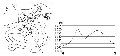 【小题2】从剖面图可以看出,从M到N的过程中,两次经过山顶,并且最高处的海拔高度高于1200米,只有沿L2才符合情况。