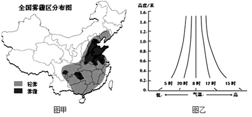 4、单选题 雾霾的形成和消散与低层大气的稳定性密切相关。读2013年12月15日全国雾霾区分布图(图甲)和该日雾霾区某地5次观测到的近地面气温垂直分布示意图(图乙),完成下列各题。