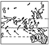 1.图中所反映的月份是2.图中①风向形成的主要原因是3.此时,北半球副热带高气压断裂成块状,是因为该气压带