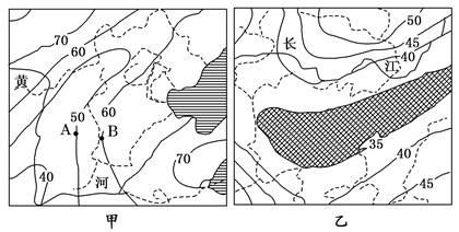 5、综合题 该图中甲、乙两图为我国两地河川夏季(6~8月)平均径流量占年平均径流总量百分比图,根据图示资料信息回答下列问题。(22分)