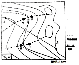 【小题1】图中索道上行方向为正南方向,可判断A处海拔较B处高。图中甲乙线是山脊,不可能形成河流;丙丁是山谷地形,河流由丙向丁流,瀑布可能出现在丁处。选D正确。