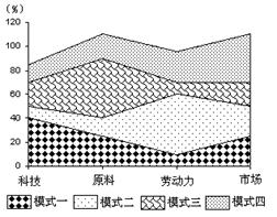 本题解析:本题考查工业区位和读图分析能力。图示反映模式一工业部门的科技影响比重高,判断为技术指向型工业;模式二工业部门的劳动力影响比重高,判断为劳动力指向型工业;模式三工业部门的原料影响比重高,判断为原料指向型工业;模式四工业部门的市场影响比重高,判断为市场指向型工业。