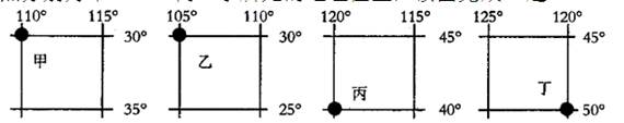 5、单选题 下图黑点分别为甲、乙、丙、丁所处的地理位置,读图完成1题。