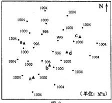 【小题2】a、c、d、e四地中,可能出现降水天气的是( )
