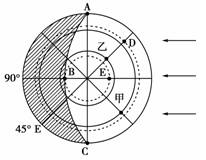 (3)A、D、E三点的自转线速度从大到小的排列顺序为__________,有一发炮弹从D点射向乙点方向,炮弹将落在D、乙所在经线的________(东或西)侧。
