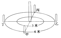 5、单选题 我国某中学建了一座太阳历广场,广场中间是6米高的雕像柱(如下图)。一年中大多数日子,正午影子投影朝丙方向,且影长从不超过6米的外圈。北京时间12:40是一天中雕像柱影子最短的时刻。据此回答下列各题。