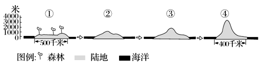 3、单选题 ①②③④四图是某大陆从地质历史时期至今沿45°纬线的地形剖面示意图(图中箭头指地形演变趋向)。读图完成下列小题。