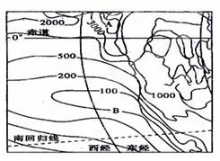 本题解析:本题考查世界区域地理。 1.根据图示的经纬度位置,经度为0°,纬度位置位于0°---23.5°S之间,故判断位于非洲西部。 2.图示B处等降水量线凸高为低,即降水量较周边地区少,结合地理位置判断为本格拉寒流影响。