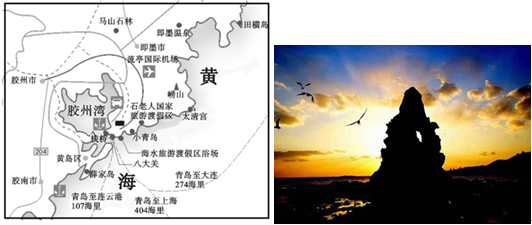 在崂山脚下临海断崖南侧,距岸百米处有一座18米高的石柱,形如老人坐在碧波之中,人称“石老人”。老公公以手托腮,注目凝神,每天晨迎旭日,暮送晚霞,伴着潮起潮落,历尽沧桑,不知度过了多少岁月。这个由大自然鬼斧神工雕凿的艺术杰作,已成为石老人国家旅游度假区的重要标志。读青岛市旅游地图和石老人景观图,思考并回答下列问题。