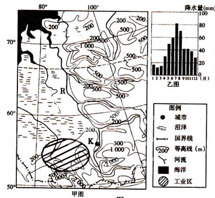 (2)图甲中R河西岸沼泽广布,试分析其成因。(4分)