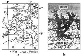 葡萄的糖分含量越高,酿制出的葡萄酒酒精度越高。葡萄生长过程中,特别是成熟期的光照及昼夜温差与其糖分积累呈正相关。图a中甲、乙两地均为优质葡萄产地。图b为乙地典型的葡萄种植园景观。世界上酒精度最高(16.2度)的优质葡萄酒就是使用乙地及其附近所产的葡萄酿制而成的。