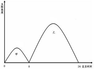 3、单选题 下图是甲乙两地一天中太阳高度变化图,读图回答1~2题