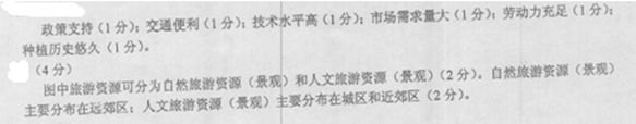 本题解析:本题考查区域的农业生产和旅游资源分布。(1)影响农业生产的主要社会经济条件可从市场、交通、科技、政策、劳动力和农业基础等方面分析。(2)旅游资源可分为自然景观和人文景观,结合图示的自然景观和人文景观的具体分布可判断,自然景观一般分布于远郊,而人文景观主要分布与市区和近郊。