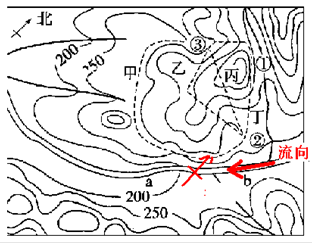 【小题1】在山区,河流位于山谷中,山谷部位的等高线向数值高处凸出,所以图中河流ab段流向是由b向a;注意图中指向标,将指向标平移到ab河段,如下图所示,可知该段河流流向为由东北向西南,故选项B正确。
