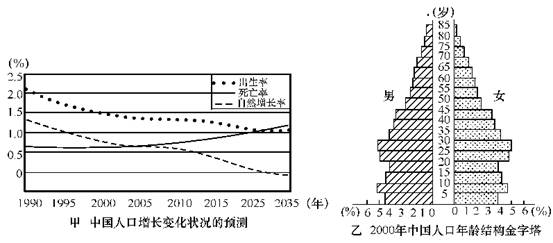 3、综合题   国家统计局2006年3月16日公布的全国1%人口抽样调查数据显示,我国总人口达到13.0628亿,与2000年相比,0-14岁人口比重下降了2.62%,65岁及以上人口比重上升了0.73%。结合甲、乙两图回答下列问题。