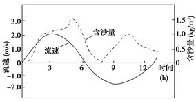 3、单选题 河流河口段是径流和潮流相互作用的区段,河口段水流做周期性往复运动。在一个潮流周期中经历涨急涨憩和落急落憩,其中落急是指潮流流速由最大降低为0的阶段。在这一过程中泥沙频繁地悬扬和落淤、前进和后退。下图为河口流速(指向下游)和含沙量过程线示意图。完成下列问题。