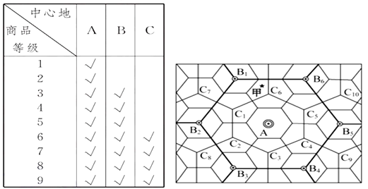 4、单选题 下面是商品等级与中心地等级关系表和中心地市场区域图,读图表完成下列各题。