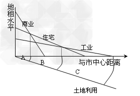 (3)市中心应为图中A、B、C中的?___;这里最适合的城市功能用地应为__?__区,?因为这里接近最大的_____? __ ,故租金最?_____。