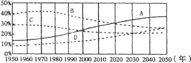 本题解析:“二战”后发达国家人口的自然增长率是不断降低的,到20世纪末很多发达国家已是负增长或零增长.则在这个过程中发达国家老年人口的比重是不断增加的。而年轻人口的比重应是不断下降的。从图中看下降的曲线有B、C两条,但B数值太高,到1990年还将近40%,不可能是发达国家的少年儿童比重。故C曲线代表发达国家少年儿童人口系数。