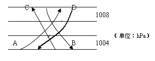 本题解析::水平气压梯度力是形成风的原动力,始终垂直于等压线,由高压指向低压,近地面的风还受到地转偏向力和摩擦力作用,最终风向与等压线斜交,且北半球地转偏向力向右偏。故选D箭头。