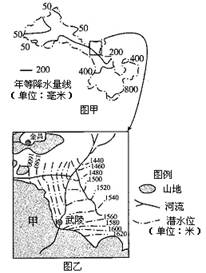3、单选题 图甲是我国某省年降水量分布图,图乙是该省某地区甲河水系示意图。读图分析回答: