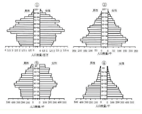 1、单选题 下图示意4个国家人口的性别一年龄构成。读下图,完成1~2题