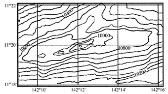 【小题1】海底地形一般分为大陆架、大陆坡、海岭、海沟、洋盆等;大陆架坡度平缓,海拔一般在0到