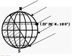 小题6:夏至日,太阳直射点位于北回归线上,根据太阳直射点与地心的连线,晨昏线与阳光相垂直,可画出晨昏线,背对阳光一侧为夜半球;北京时间(120°E)为8点,则太阳直射点的经线为12时所在经线为180°经线;太阳直射的纬度为23.5°N。