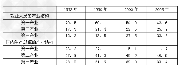 1、单选题 读中国三大产业就业结构和产值结构表(% ),回答1-2题。