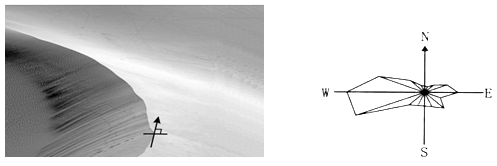 材料 洛杉矶及周边地区晴天较多,海滩、沙漠等多样的景观为电影拍摄提供了良好的自然条件。左图是该地区盛行风作用下形成的某一新月形沙丘局部图,右图是沙丘所在地风频图。