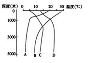 本题解析:首先是海水温度随深度增加温度递减。深度达到1000米以下,海水温度基本不变。符合的是A项。