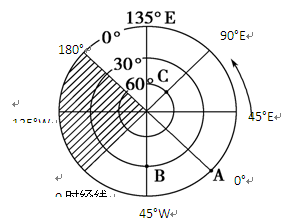 0时经线为90°W,A点(0°)为6:00点(东加西减。经度差15°,时间差1小时。)选C。