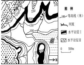 【小题1】水平岩层Ⅱ最厚的地方位于西南地区,厚度接近 150 米,比岩层Ⅰ厚;坡度缓的地方水平岩层出露宽度大,坡度陡的地方水平岩 层出露宽度小;水平岩层Ⅰ在各处的海拔相差不大,且位于水平岩层 Ⅱ的下部,形成时间早于水平岩层Ⅱ。 故 B 项正确。