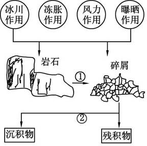 参考答案:D 本题解析:背斜岩层在内力作用下向上拱起,一般形成山地,而由于背斜顶部受张力作用,容易被侵蚀而形成谷地,A、C错误;在外力作用中,流水作用是最常见,分布最普遍的外力作用,B错误。断层是由于岩层的断裂和错位而形成,故容易形成裂谷或陡崖,D正确。 本题难度:一般 3、单选题 下列选项与下图中①、②最符合的是(?) 参考答案:A 本题解析:外力作用包括五种:风化、侵蚀、搬运、沉积、固结成岩。过程①主要表现为在冰川、风、热胀冷缩的物理作用下,坚硬的岩石逐渐崩解为碎屑,属于物理风化过程;过程②主要表现为松散的碎屑物,变成沉积物,必然要经过搬运、沉积作用才能实现。 本题难度:简单 4、单选题 “水滴石穿”描述的是哪种外力作用 参考答案:D 本题解析:略 本题难度:一般 5、单选题 下表为中国径流带主要特征值,据此回答18—19题。 参考答案: 本题解析: 本题难度:简单 |