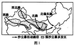 (2)西北路沙尘暴先后影响的地理区域有:__________盆地、河西走廊、内蒙古高原、__________高原