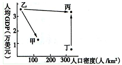 A.地区政策 B.晚婚习俗 C.优美的环境 D.文化观念 3、综合题 (14分)读美国本土地形图和人口分布图,回答问题。 4、单选题 读“甲、乙、丙、丁四国人均GDP和人口密度相关示意”图,回答 |