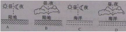 2、单选题  下列四幅图所示的情况中,昼夜温差最小的是
