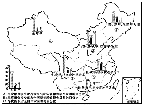 (2)读图,②区的旱灾粮食损失量占全国旱灾粮食损失总量的百分比(B)、旱灾面积占全国旱灾面积的百分比(C)均最高。所以图中旱灾最严重的地区是②区。