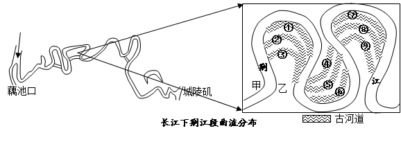 2、单选题 河流的中下游侧蚀作用明显,河流不断地侵蚀河岸、扩展河床,致使河道不断弯曲,以致河道变迁。读长江下荆江段曲流分布示意图,回答问题。