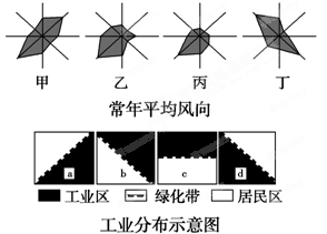 图中数码③④所示地区与下列“常年平均风向”“工业分布示意图”连线正确的是