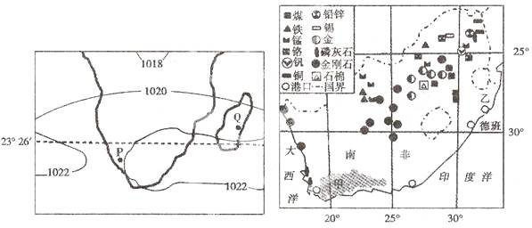 A.季风水田农业 B.商品谷物农业 C.地中海式农业 D.混合农业 3、综合题 (12分)下面左图为非洲南部及其周边海域某月海平面气压(单位:hPa)分布图,右图为南非重要的矿产资源和港口分布示意图。读图回答下列问题。