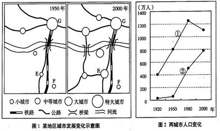 (1)由图可知,从1950年到2000年该地区城市数目不断增加,城市规模不断扩大,这些都是城市人口增加导致的,所以城市化的标志应该是城市人口占总人口的比重不断上升。