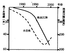 3、单选题 下图是某地地下水水位(虚线)和地面沉降(实线)的变化图,读图回答以下两题。