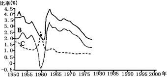 (1)图中三条曲线分别代表人口出生率、人口死亡率与人口自然增长率,A为??、