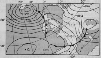4、单选题 下图为某曰某时刻欧洲西部部分地区海平面等压线分布图(单位:百帕)。读图回答下列各题。