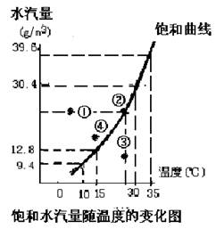 2、单选题 读“饱和水汽量随温度变化图”与“低层大气相对湿度日变化图”(右图) (相对湿度指在一定时间内,某处空气中所含水汽量与该气温下饱和水汽量的百分比)。回答下列问题。